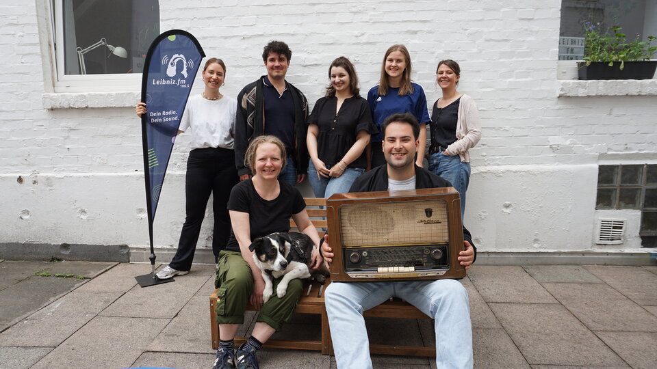 Team Leibniz fm. Hinten von li nach re: Olivia Wilke, Malte Busch, Anna Brucks, Anne Bartels, Mareike Röhricht, vorne von li nach re: Claudia Tadje, Robin Shakibaie. Foto: © Robert Litz